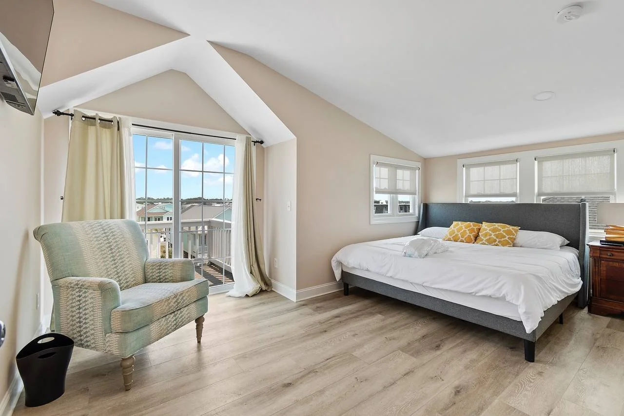 A Queen bedroom with shared bathroom. Two of these rooms available. Each with balcony access on the back side of the home for a private reprieve.